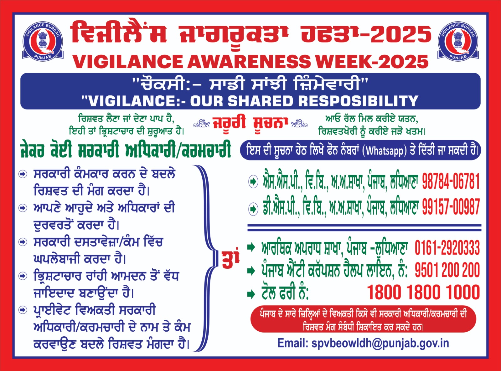 ਲੁਧਿਆਣਾ, 27 ਅਕਤੂਬਰ (ਅਮਰ ਸਿੰਘ ਮਾਹਲਾ) – ਵਿਜੀਲੈਂਸ ਬਿਊਰੋ ਲੁਧਿਆਣਾ ਵੱਲੋਂ 27 ਅਕਤੂਬਰ ਤੋਂ 02 ਨਵੰਬਰ ਤੱਕ ਭ੍ਰਿਸ਼ਟਾਚਾਰ ਵਿਰੋਧੀ ਹਫ਼ਤ ਮਨਾਇਆ ਜਾ ਰਿਹਾ ਹੈ।